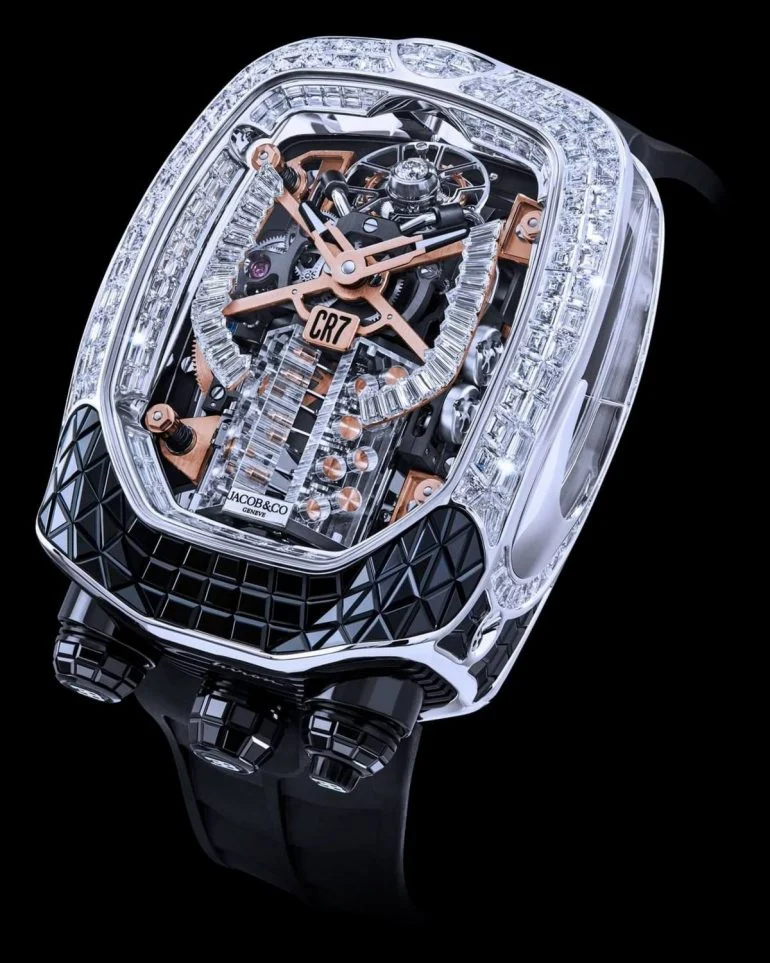 Starul fotbalului a colaborat cu renumitul brand de ceasuri Jacob & Co. pentru a realiza un ceas unic inspirat de mașina sa personalizată Bugatti Chiron CR7. Bijuteria în valoare de 1 milion de dolari are culorile mașinii, mai exact negru și argintiu, logo-ul CR7, precum și o replică în miniatură a motorului său W16 cu 16 pistoane care pompează în sus și în jos în interiorul cristalului de safir transparent. Ceasul special este, de asemenea, acoperit de aproape 400 de pietre prețioase, inclusiv 232 de diamante albe și 109 de safire negre, care cântăresc în total 21 de carate.