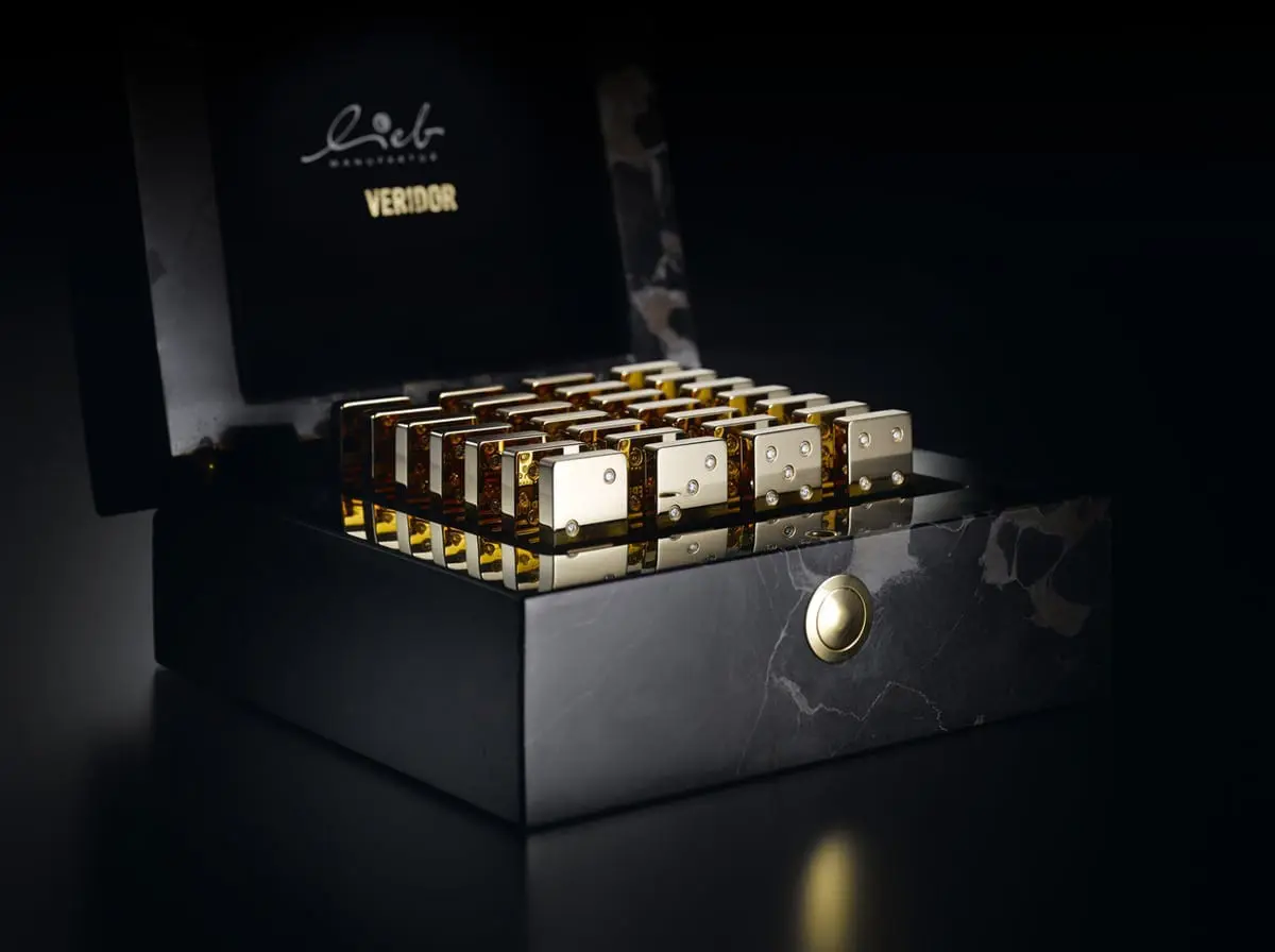 Format din 28 de piese din aur masiv care cântăresc 2,4 kilograme și sunt decorate cu 168 de diamante, setul Domino by Lieb Manufaktur & VERIDOR este o adevărată operă de artă ce creează o legătură între unicitate și valoare atemporală. Acesta este, de fapt, o întruchipare a dogmelor companiei producătoare, bazate pe „plăcerea în unicitate și dragostea pentru detalii”. Mai mult, însuși numele de Lieb Manufaktur sugerează plăcerea prin excelență, iar setul de domino decorat cu diamante se dovedește a fi o expresie a culturii companiei.