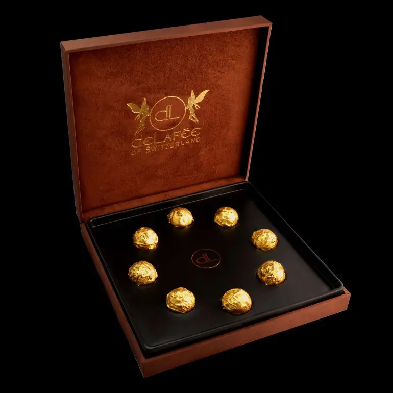 Luxul elvețian atinge apogeul cu ciocolatele DeLafée, unde aurul comestibil de 24 de carate împodobește creații rafinate. Aceste ciocolate sunt deopotrivă obiecte de artă și dulciuri și sunt adesea însoțite de monede de colecție sau cutii foarte elegante. Prețurile pot varia între 100 și 500 de dolari pe cutie, în funcție de ediție, iar experiența de a degusta DeLafée este o performanță în rafinament.