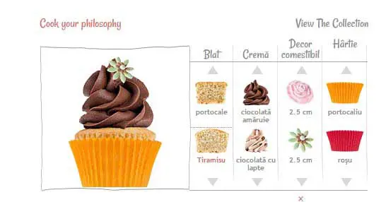 Intră în configuratorul online ”Cook your philosophy” și lasă-te purtat în universul dulciurilor cu filosofie, unde există acel cupcake care îți poartă semnătura. Trebuie doar să-i dai contur, alegând din cele 11 tipuri de blat, 21 de creme delicioase, 79 de decorațiuni comestibile și 19 hârtii colorate. Mai mult, îi poți scrie și filosofia, ca să-și câștige titlul de cupcake-filosofie și să intre în colecția spectaculoasă ”Cupcakes create de musafiri”.