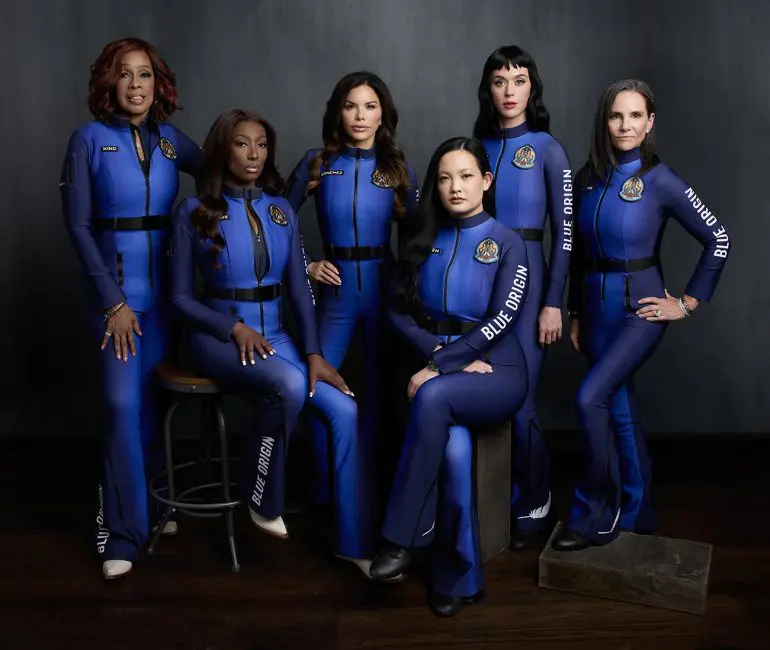 Katy Perry (artistă pop), Gayle King (jurnalistă și personalitate TV americană), Aisha Bowe (inginer aerospațial și antreprenoare), Amanda Nguyễn (antreprenoare și activistă pentru drepturi civile), Kerianne Flynn (producătoare de film) și Lauren Sánchez (jurnalistă, autoare și filantroapă) sunt cele șase femei care au alcătuit echipajul navei spațiale. Acestea au purtat costume special create pentru acest eveniment de brandul Monse.
