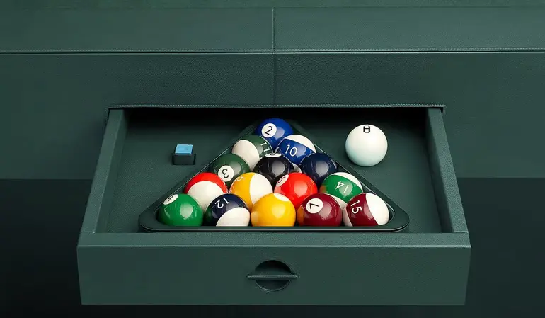 Cu o siluetă curată, arhetipală, impresionanta masă de biliard echilibrează familiarul cu luxul. Fiecare suprafață vizibilă pune în valoare expertiza brandului în lucrul cu materialele. Marginile sunt îmbrăcate în piele mată, corpul este îmbrăcat în piele, picioarele sculpturale sunt lăcuite și buzunarele sunt realizate din piele Taurillon Regate.