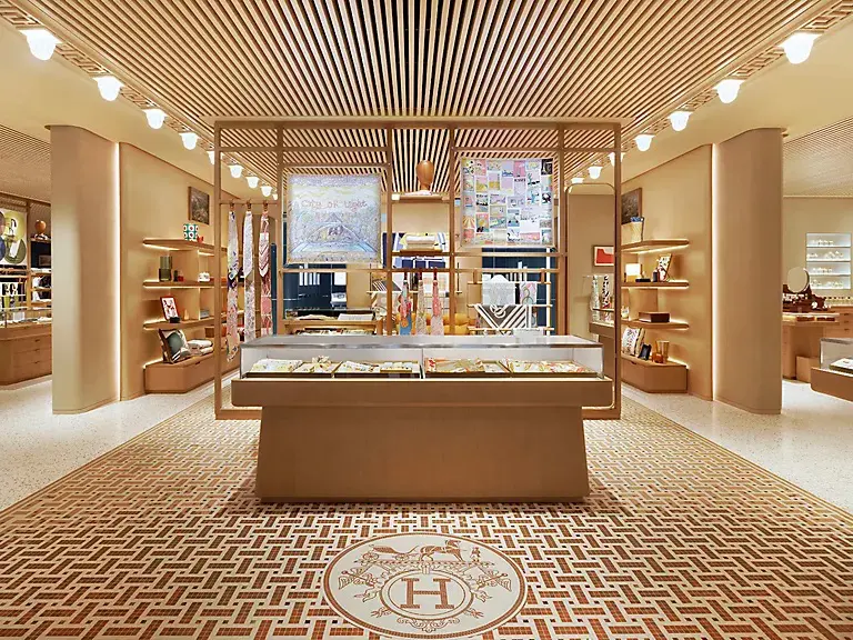 Interiorul magazinul este creat astfel încât materialele și culorile ghidează experiența vizitatorului. Pardoseala din mozaic semnătură Hermès trece gradual de la tonuri calde, pământii, la nuanțe reci, acvatice, marcând traseul prin cele șaisprezece métiers ale casei. De la mătase și colecțiile pentru casă care se află la intrare, până la bijuterii și orologerie ce se regăsesc în partea din spate, spațiul construiește o narațiune coerentă a meșteșugului.