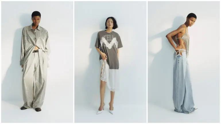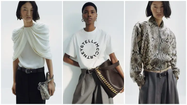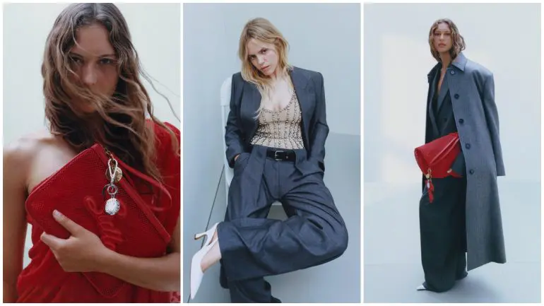 Colecția aduce împreună trecutul și prezentul, combinând stilurile emblematice actuale ale brandului, precum cămășile oversized, trench-urile ample și croielile sharp, cu piese iconice, jucăușe, din arhiva timpurie McCartney, inclusiv printuri cu aplicații strălucitoare și topuri cu mesaje.