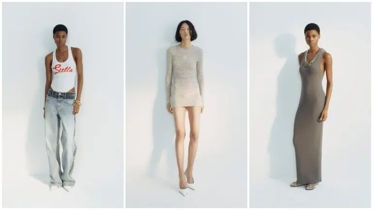Printre piesele-cheie ale colecției se numără rochii și topuri din tricot reiat, decorate la baza gâtului cu lanțul Falabella — semnătura McCartney — precum și o rochie lungă albă, cu mânecă tip capă, care se continuă în tiv, creând efectul unui cerc amplu de material. Colecția include, de asemenea, piese strălucitoare pentru petreceri, articole separate și piese din denim, alături de rochii și topuri din plasă, imprimate cu un curajos print cu cireșe din arhivă. Un plus de nostalgie este adus de un tricou alb mini, decorat cu ținte și inscripționat cu mesajul ‘Rock Royalty’.