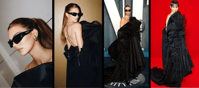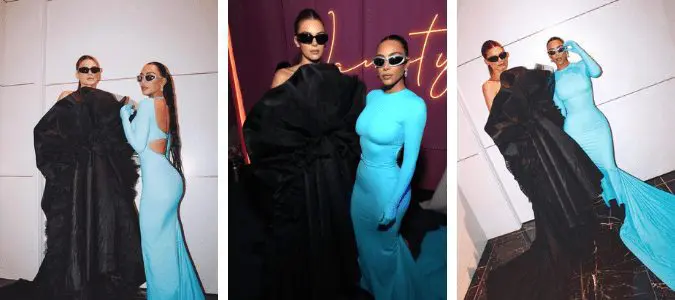 În mod surprinzător, Kim nu a fost singura din familie care a ales să poarte un full look Balenciaga. Sora sa mai mică, Kendall Jenner, a apărut pe covorul roșu alături de Kim, purtând un outfit iconic, creat de celebra casa franceză: o rochie neagră cu volane, prezentată în colecția Spring-Summer 22. De asemenea, Kendall a optat pentru aceeași coafură și aceeași tușă finală a ținutei: ochelarii de soare Balenciaga.