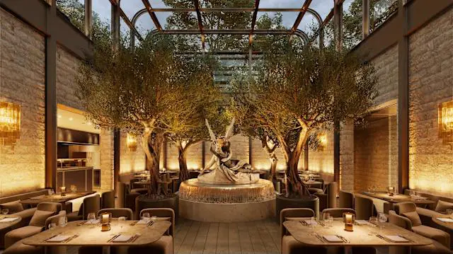 De aici, vizitatorii pot păși într-o curte amenajată peisagistic ce conduce către o grădină privată care oferă acces spre La Volta, un restaurant și bar subteran conceput ca o succesiune de încăperi boltite din calcar. Aici, în centrul salonului de dining se regăsește o reinterpretare a sculpturii „Amore e Psiche” realizată de Fabio. Oferta culinară se inspiră din tradiția italiană și cuprinde pizza, risotto, paste artizanale și cotlet milanez.