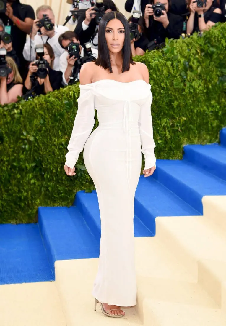 Spre deosebire de stilul său caracteristic, Kim Kardashian a optat pentru o apariție simplă, Vivienne Westwood. Rochia albă, în stil minimalist, căzută pe umeri, care i-a pus în evidență formele voluptoase, a fost accesorizată cu o pereche de sandale în nuanțe nude.