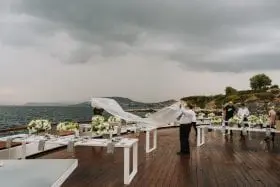 Proiectul acesta a fost pentru Dichis Signature Events o gură de aer proaspăt, dar și o provocare. Întreaga logistică – flori, decor, lumini – a fost pregătită și adusă din România, iar înaintea evenimentului s-a lucrat 48 de ore non-stop pentru ca totul să fie perfect: de la montajul scenei principale pe apă, la instalarea mulțimii de oglinzi pregătite și a tavanului de lumini care să aducă conceptul la viață și până la a salva absolut totul de furtuna pornită cu doar două ore înaintea evenimentului, prima din ultimii 40 de ani în zonă. În cele din urmă, cei de la Dichis chiar sunt adepții binecunoscutei vorbe potrivit căreia „ce nu te omoară te face mai puternic” și au văzut această pățanie ca pe o experiență prin care li s-a confirmat cât de bine pot lucra împreună, chiar și în condiții nefavorabile.