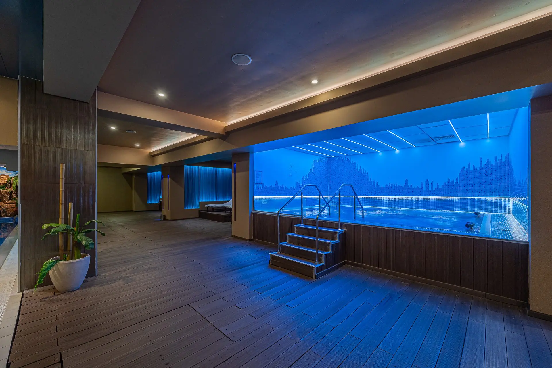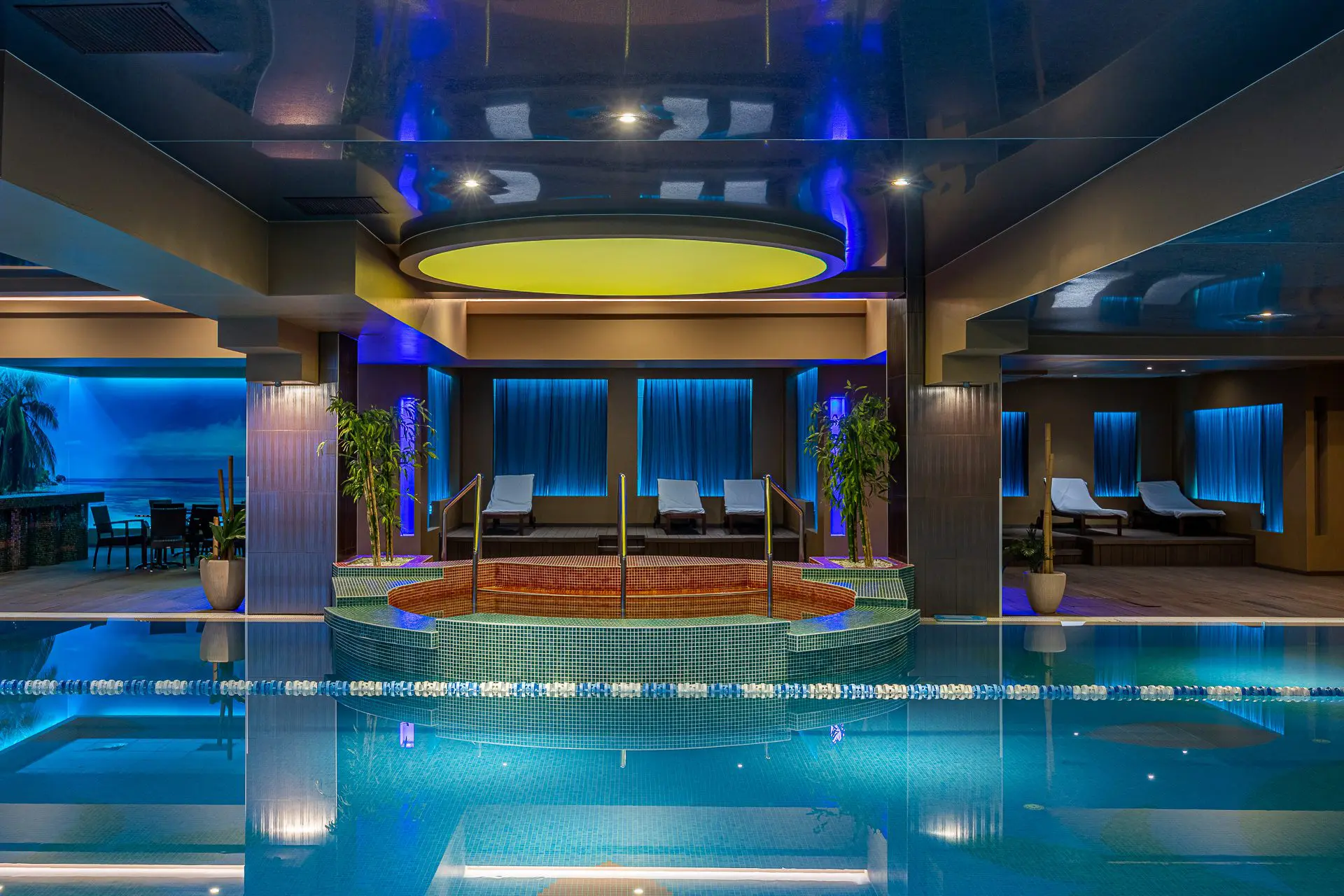 Având o dimensiune generoasă și un design modern de inspirație naturală, piscina oferă condiții optime pentru înot sau exerciții în apă. După câteva ture de bazin sau o clasă de aqua fitness, te poți revigora în jacuzzi sau odihni pe șezlongurile confortabile din apropierea piscinei.