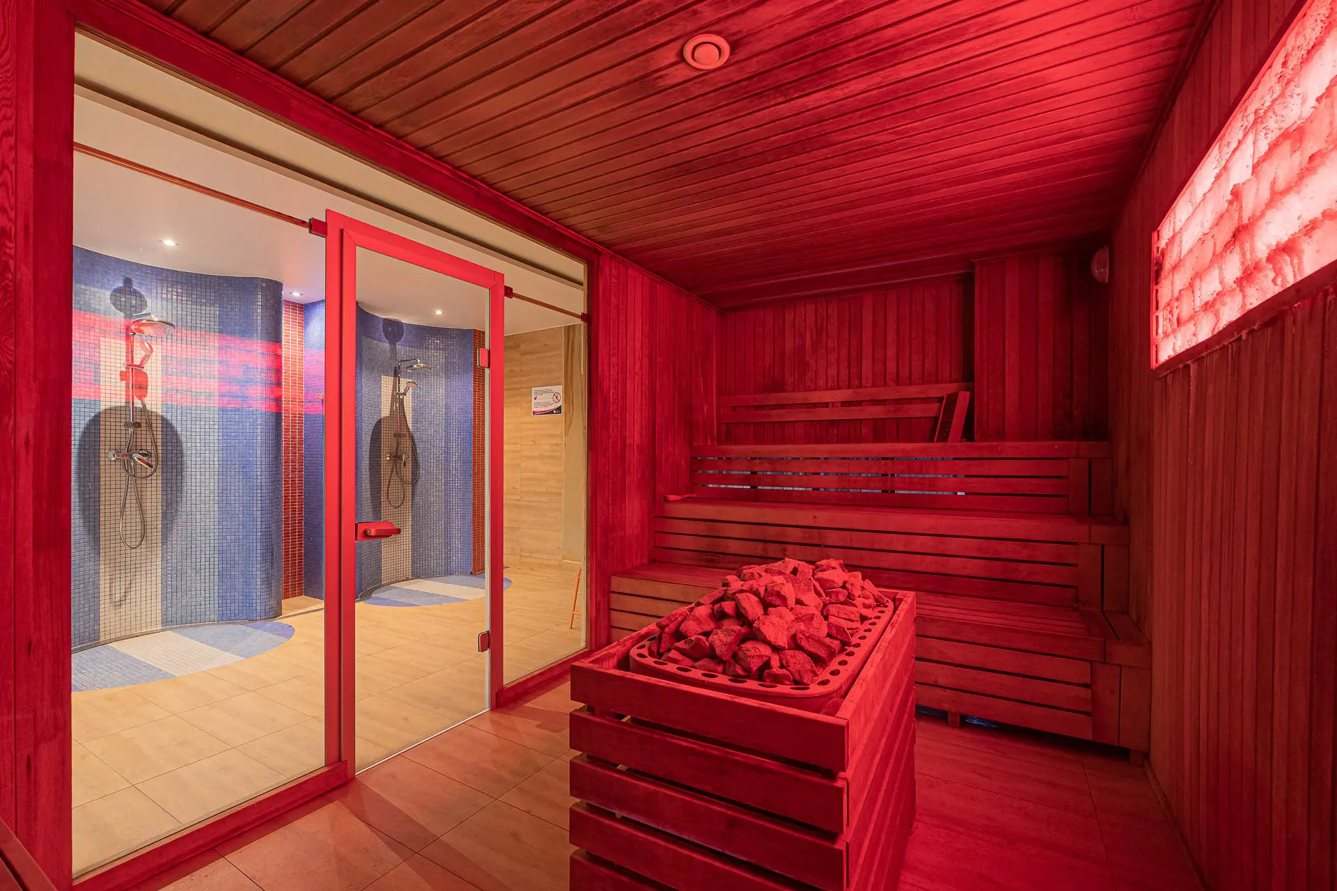 Pereții saunei includ și cărămidă de sare de Himalaya, iar prin încălzire se produc ioni negativi care creează un microclimat natural și pur. Este dovedit știintific că particulele de sare au un efect curativ asupra sănătății, îmbunătățesc respirația, detoxifică și energizează corpul și calmează mintea.