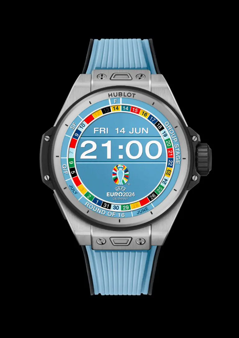 Acest ceas conectat se potrivește perfect cu codurile colecției Big Bang. Carcasa de 44 de milimetri, realizată din titan, are o construcție tip sandwich, o abordare inventată de Hublot în 2005. Geamul de safir este rezistent la zgârieturi, iar cureaua de cauciuc are o cataramă pliabilă și poate fi schimbată cu ușurință folosind sistemul patentat One Click. Carcasa găzduiește un procesor Qualcomm Snapdragon Wear 4100+. Caracteristicile notabile includ opt senzori diferiți și conectivitate de plată GPS, Bluetooth, Wi-Fi și NFC. Big Bang e Gen3 este, desigur, compatibil atât cu sistemul de operare Google Android, cât și cu Apple iOS. Ca să poată fi îmbrăcat în culorile echipelor preferate ale purtătorului, fundalul ecranului și curelele pot fi schimbate. Acest nou ceas conectat va permite purtătorului său să urmărească – în timp real – faza finală a următorului Campionat European UEFA 2024, care va avea loc în Germania, în perioada 14 iunie – 14 iulie. Alăturați-vă Hublot la München pe 14 iunie pentru meciul de deschidere al UEFA EURO 2024, pentru că, asemenea nouă, Hublot iubește fotbalul!