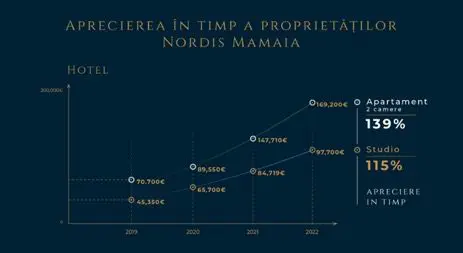 Valoarea de la acest moment a apartamentelor Nordis Mamaia validează o alegere inspirată a cumpărătorilor care au achiziționat încă de la începului proiectului, aprecierea în timp a proprietăților Nordis Mamaia atingând chiar și 139%. Acest fapt este dovada clară că valoarea investițiilor imobiliare poate crește mult mai mult decât se estimează și că indiferent de vremurile provocatoare parcurse, mai exact pandemia și războiul, sectorul imobiliar rămâne cea mai sigură și profitabilă investiție dintre toate cele existente pe piață.