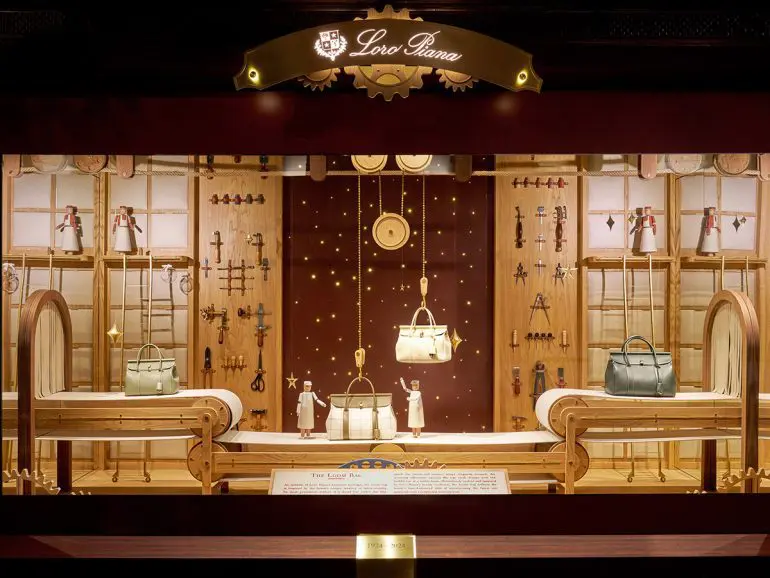 Magnifica fațadă de pe Brompton Road, o poveste încântătoare a călătoriei unei fibre de la moliciunea unui nor la o țesătură rafinată, captivează vizitatorii cu un brad de sărbători înalt de 17 metri, împodobit cu straturi festive de țesături Loro Piana. Ca o tapiserie magică, fiecare dintre cele 36 de vitrine ale Harrods spune o poveste: scene din Mongolia până în Australia și Italia dezvăluie dedicarea mărcii pentru cele mai bune materiale din lume și pentru maeștrii artizani care le transformă în articole de îmbrăcăminte râvnite. Sub o estetică caldă și nostalgică a anilor 1920, aceste ferestre povestesc călătoria fibrelor-Vicuña, Baby Cashmere și lâna The Gift of Kings® – urmând traseul materialelor până în Italia, unde acestea devin simboluri ale luxului rafinat.
