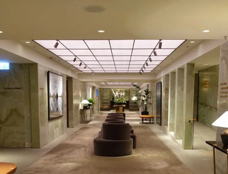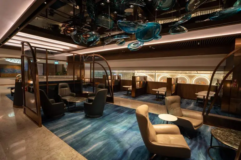 Cathay Pacific a creat un spațiu care emană eleganță prin designul asiatic contemporan, tonuri calde de lemn și detalii senzoriale subtile. Lounge-ul are mai multe zone: The Retreat, cu suite de odihnă și 14 dușuri private, The Bureau, cu stații iMac, și The Dining Room, unde mesele à la carte sunt un adevărat răsfăț. De asemenea, oaspeții se pot bucura de masaje sau pot răsfoi cărți selectate în The Library. Atmosfera din lounge este completată de parfumuri personalizate și lumini difuze, pentru o experiență profund relaxantă.