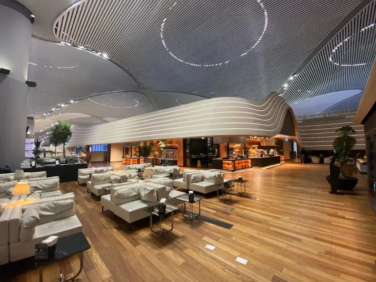 Aeroportul din Istanbul găzduiește unul dintre cele mai mari lounge-uri din lume, are este aproape un mic oraș. Bufetele fastuoase celebrează bucătăria turcească și internațională, unde bucătarii pregătesc gözleme, pide și carne la grătar în fața pasagerilor. Spațiul include zone de relaxare, suite de duș moderne și zone interactive de divertisment. Deși are o capacitate de peste 700 de persoane, designul atent creează zone intime, îmbinând energia cu calmul – o reflectare perfectă a spiritului Istanbulului.